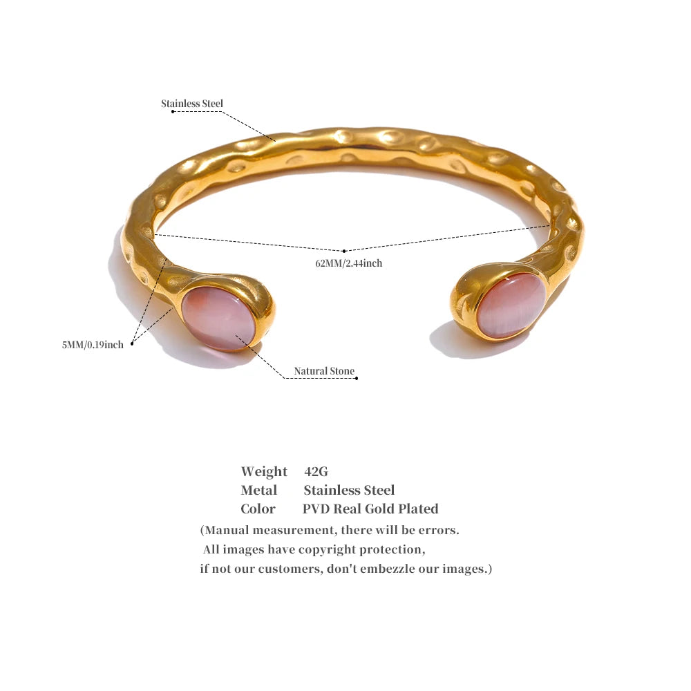 Dieses 62 mm lange offene Armreifarmband aus vergoldetem Edelstahl ist mit Natursteinen in verschiedenen Farbtönen (Rosa, Grün, Schwarz, Perlmutt usw.) verziert. Seine gehämmerte Form und das halbstarre Design verleihen ihm einen schicken, handwerklichen Touch.