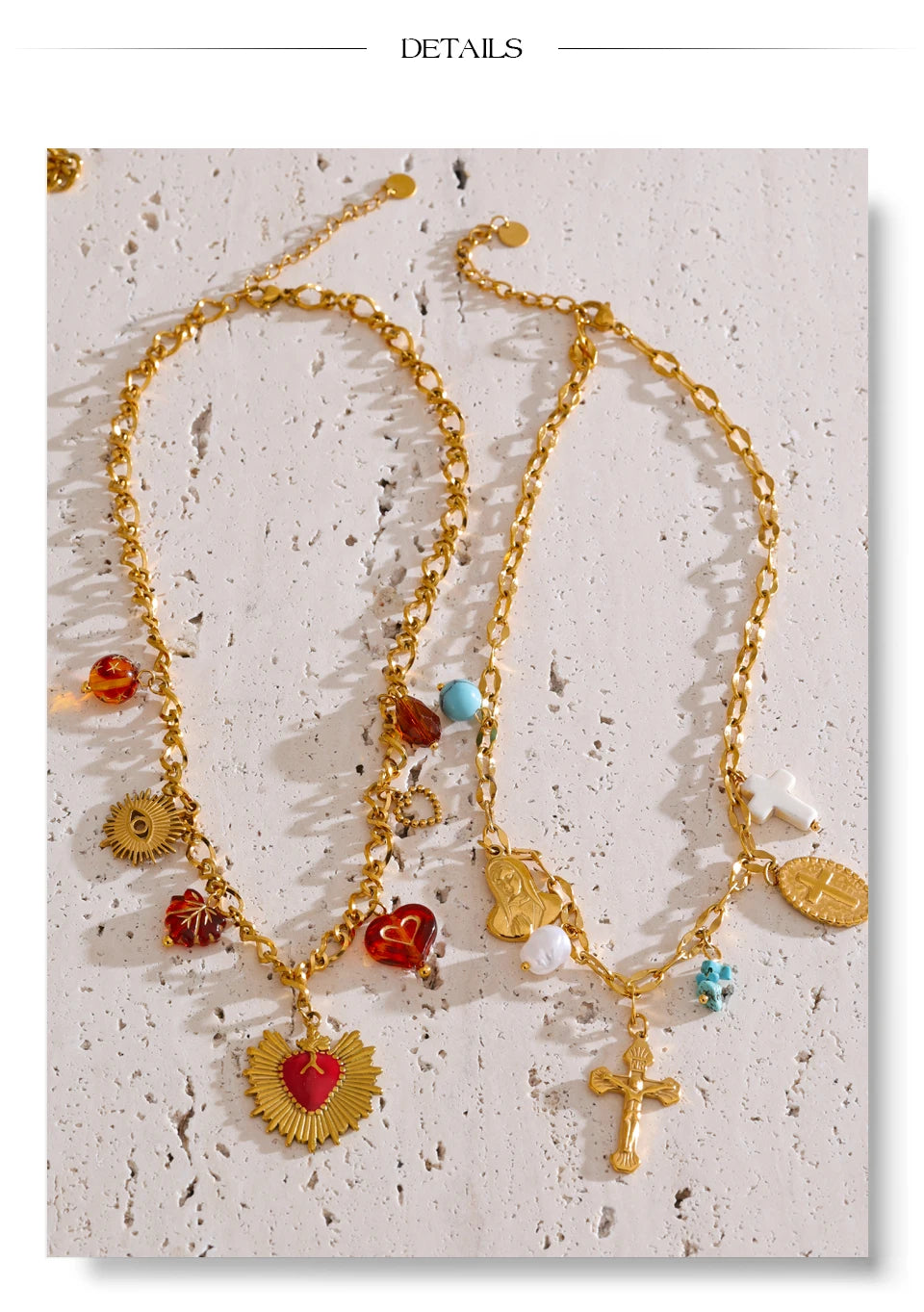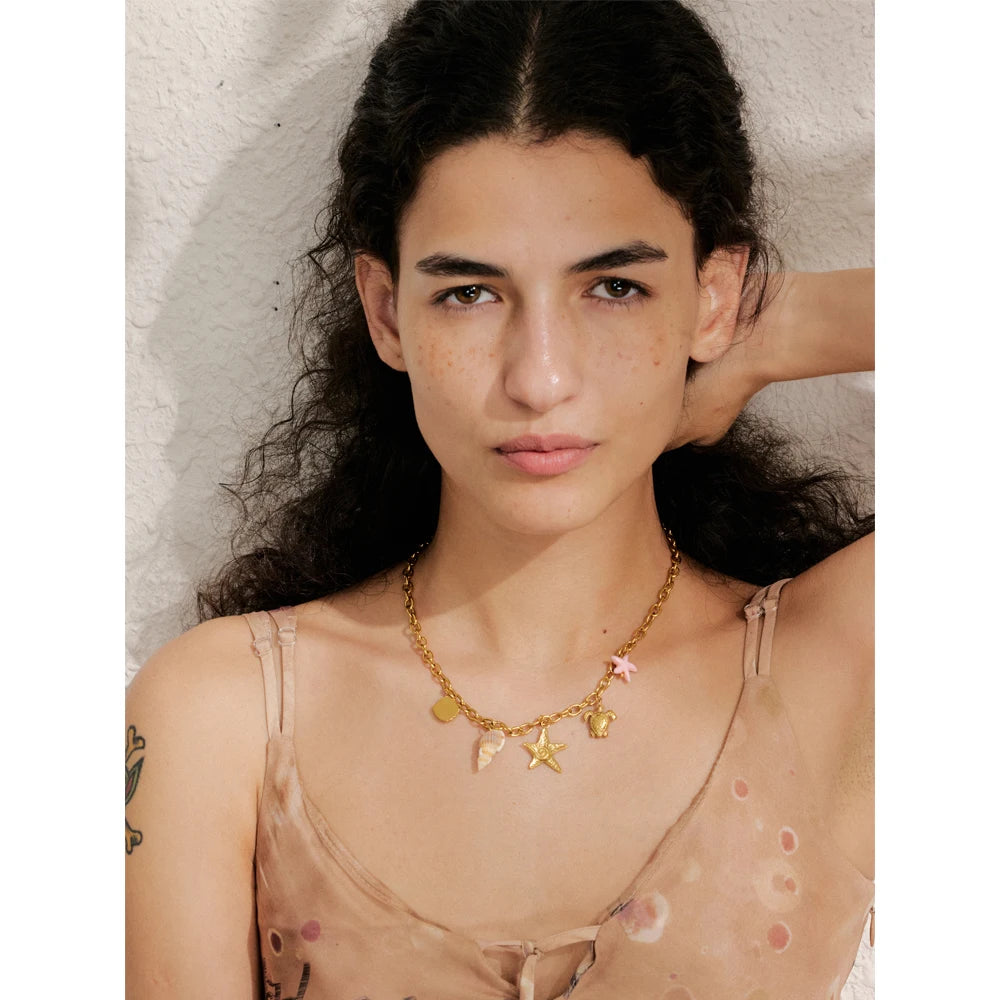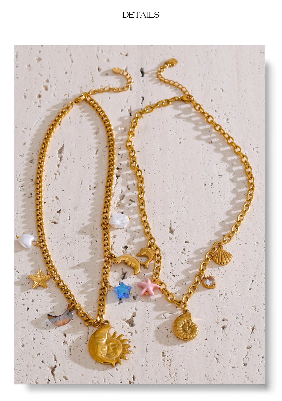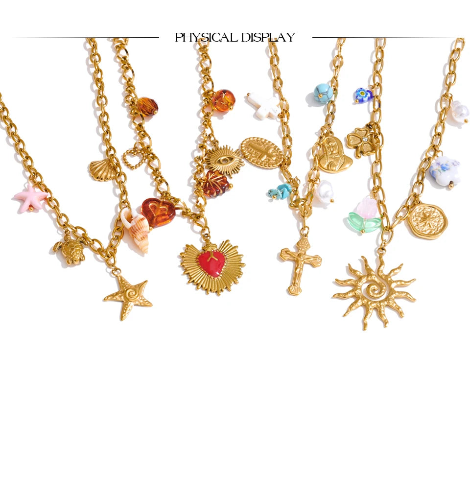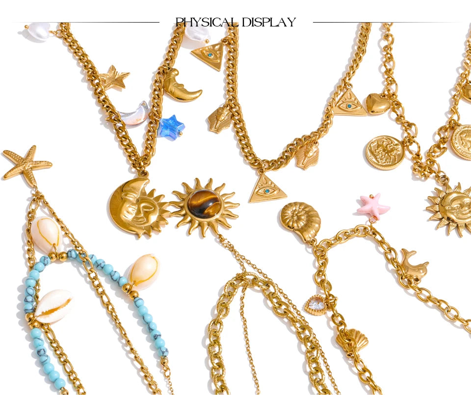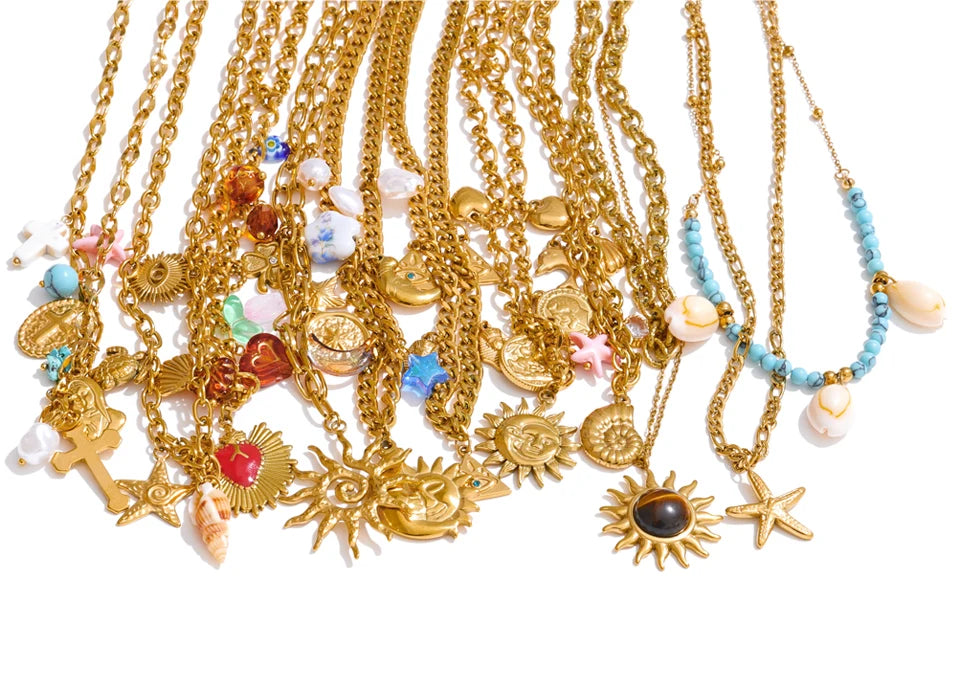 Diese Halsketten aus 18 Karat PVD-beschichtetem Edelstahl sind mit Anhängern verziert, die vom Meer und der Sonne inspiriert sind : Seesterne, Herzen, Muscheln, Kreuze, Sonnen ... Jedes Modell ist handgefertigt , wobei besonderes Augenmerk auf Details und Farben gelegt wird.