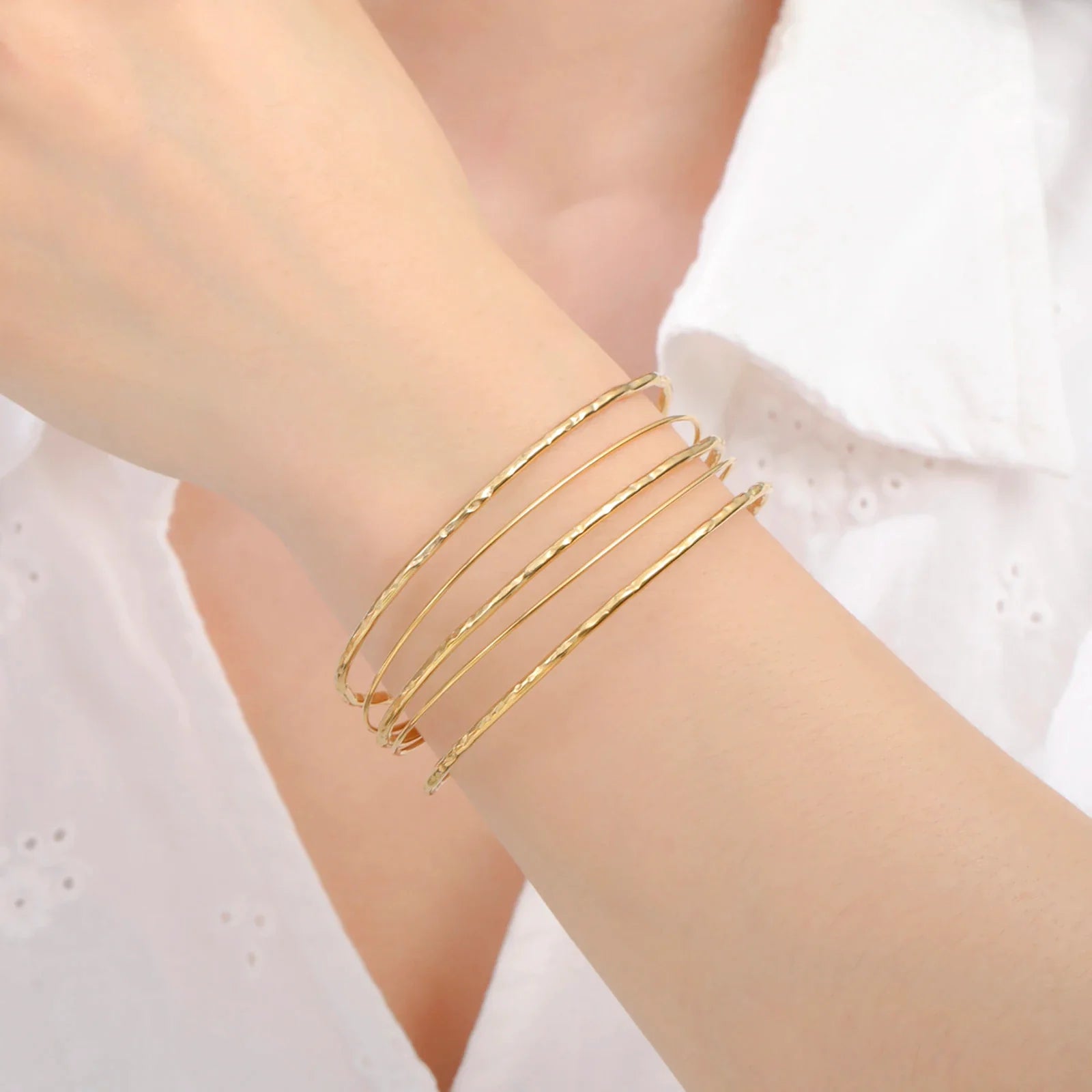Ce bracelet manchette multi-rangs en acier inoxydable doré structure le poignet avec caractère. Ses plusieurs anneaux ouverts créent un effet de superposition intégré, idéal pour accompagner une tenue simple.