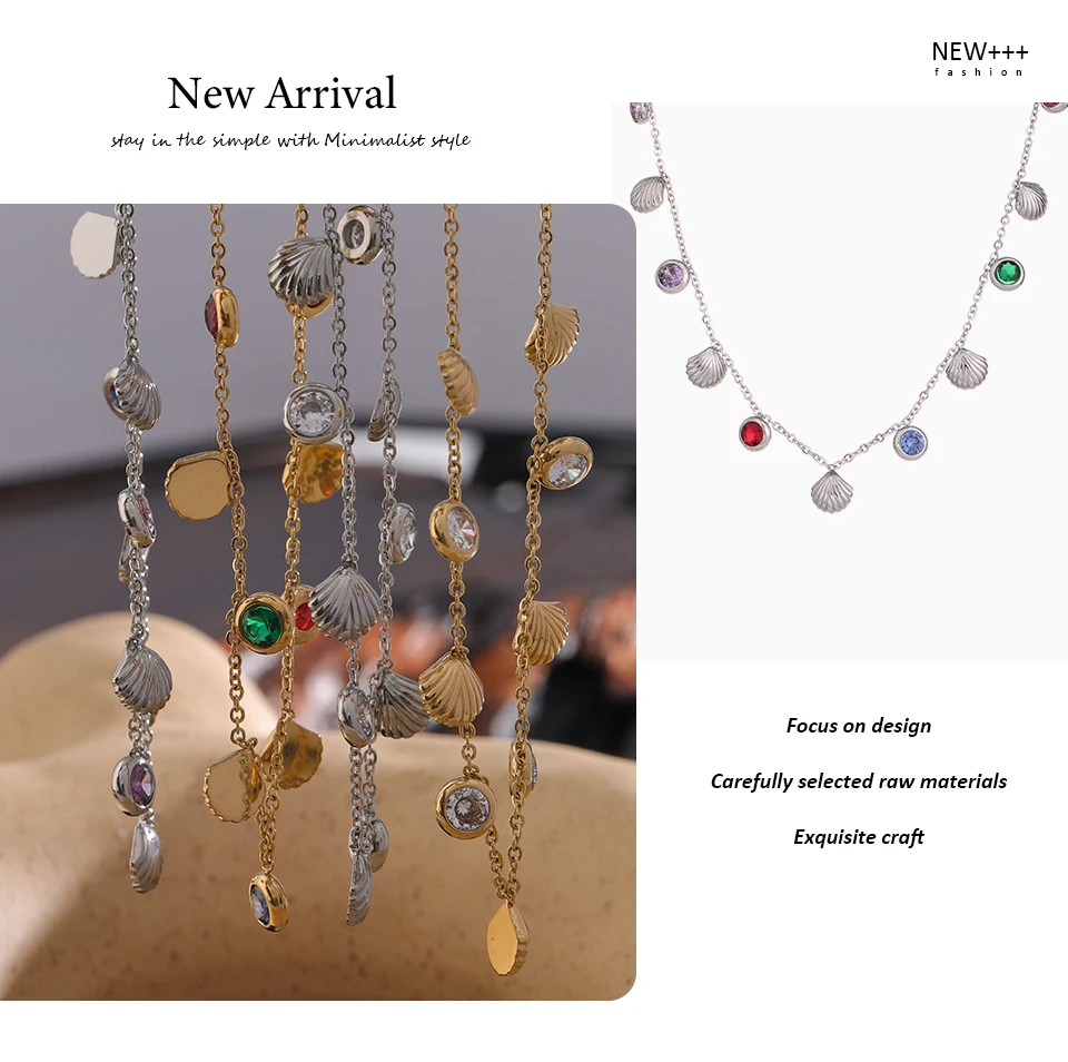 Ce collier en acier inoxydable doré est orné de zircones cubiques multicolores et de petites pampilles coquillage, pour un rendu à la fois frais, féminin et tendance.
